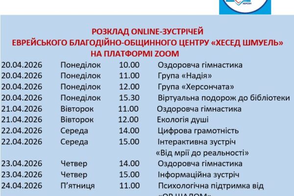 24.03.2026Готуємось до свята Песах. 23 березня відбувся online-захід на якому були присутні учасники проекту «ДАВАЙ ПІДКЛЮЧИМОСЯ» та клубних програм. Разом обговорювали з чого почати наводити порядок, із прибирання оселі чи з «ревізії» думок. Притча, інтерактив (вікторина), візуалізація зображення (презентація та відеопоради) і обов’язково гумор допомогли все розкласти по поличках...